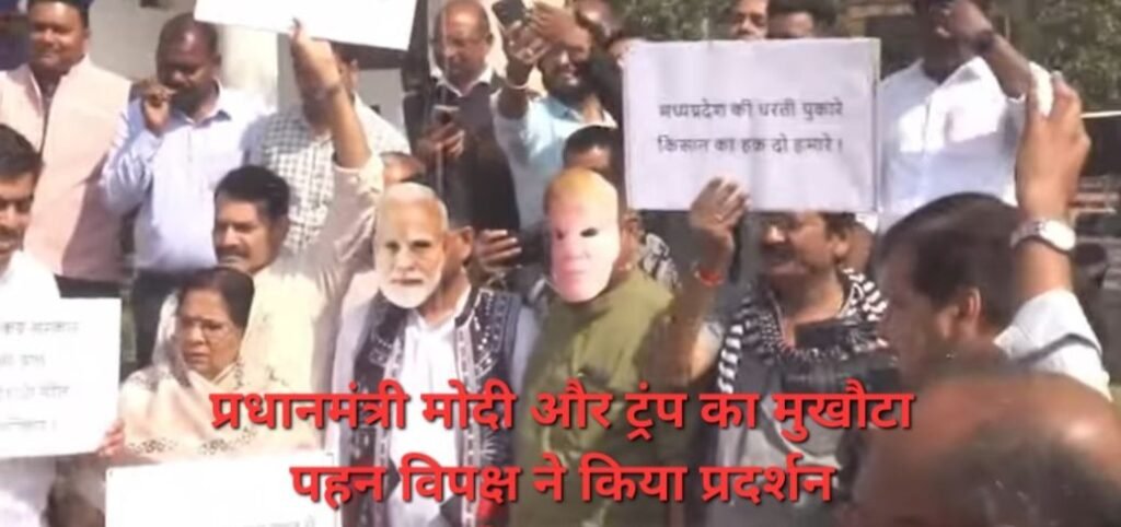 अमेरिका से ट्रेड डील को लेकर विपक्ष ने सदन के बाहर हंगामा किया । जिसमें पीएम मोदी और अमेरिका के राष्ट्रपति ट्रंप का मुखौटा पहनकर सरकार को बताया किसान विरोधी।