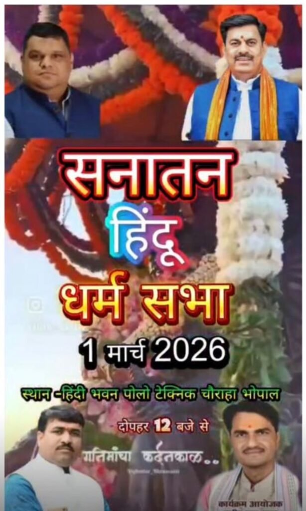 भारतीय संस्कृति, सनातन परंपरा और आध्यात्मिक चेतना के संवर्धन एवं संरक्षण के उद्देश्य से मध्यप्रदेश की राजधानी भोपाल स्थित हिंदी भवन में एक भव्य सनातन धर्म सभा का आयोजन दिनांक 01/ मार्च/ 2026 दिन रविवार दोपहर 02 बजे से समापन समय तक किया जा रहा है। यह आयोजन न केवल धार्मिक दृष्टि से महत्वपूर्ण है, बल्कि सामाजिक, सांस्कृतिक और राष्ट्रीय चेतना के दृष्टिकोण से भी अत्यंत प्रेरणादायी माना जा रहा है। इस पावन अवसर पर देश के प्रतिष्ठित व्यक्तित्व, विद्वान, धर्माचार्य, सामाजिक कार्यकर्ता तथा नगर एवं नगर के बाहर से पधारने वाले अनेक विद्वान अपनी उपस्थिति से इस सभा को गौरवान्वित करेंगे। इस ऐतिहासिक धर्मसभा में राष्ट्रीय स्तर के प्रमुख व्यक्तित्वों का सान्निध्य प्राप्त होगा, जिनमें विशेष अतिथि के रूप में भी प्रियंक कानूनगो जी जो कि राष्ट्रीय मानवाधिकार आयोग नई दिल्ली के प्रतिष्ठित सदस्य हैं।